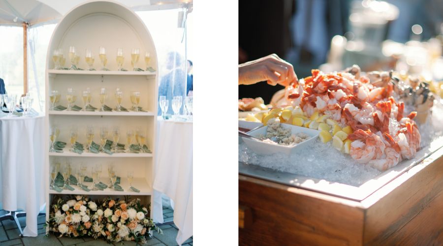 Think custom cocktail bars where guests can build their own drink based on your wedding theme, champagne shelves, or a raw bar station that sparks conversation and excitement. These experiences turn mealtime into a memory, especially when paired with Wentworth by the Sea Country Club’s refined dining service and scenic settings.
